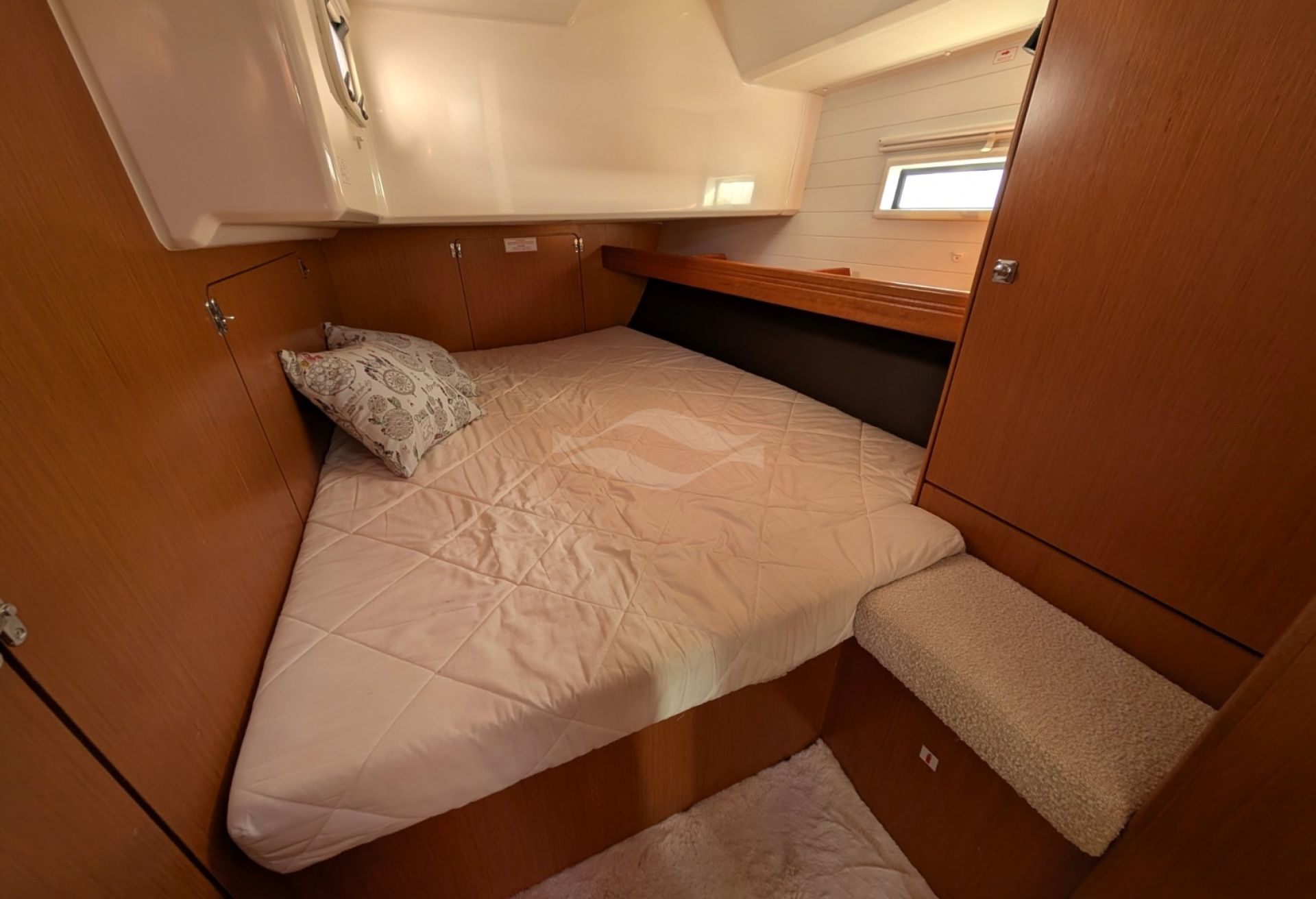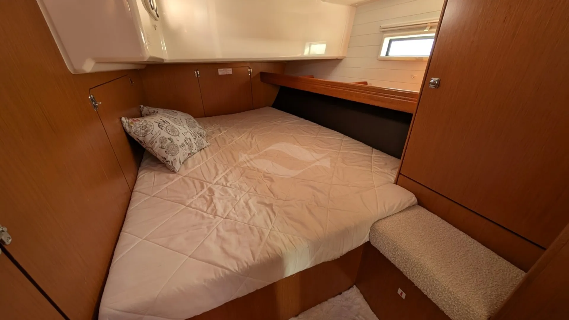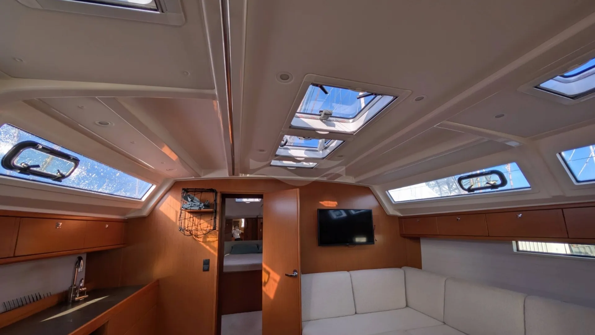 Licensed for 12 passengers (factory rating 16), she provides ample space for groups while maintaining privacy and comfort below deck. Her interior is bright, practical, and designed for life aboard — with generous storage, efficient ventilation, and a layout that seamlessly supports both short getaways and longer cruising adventures.