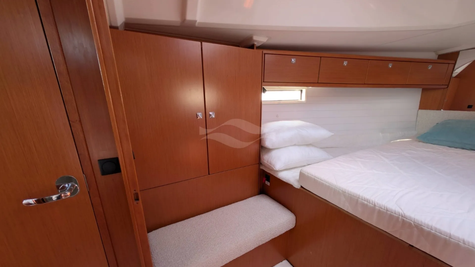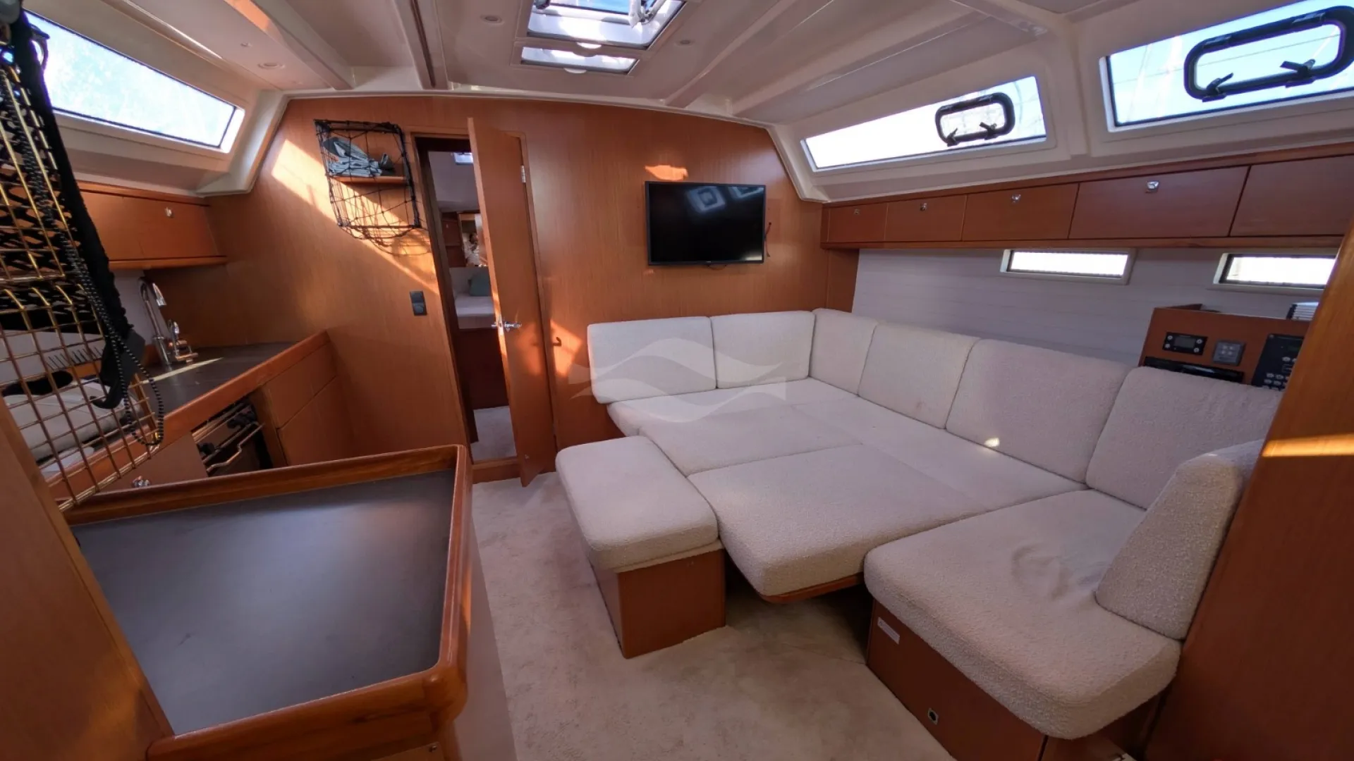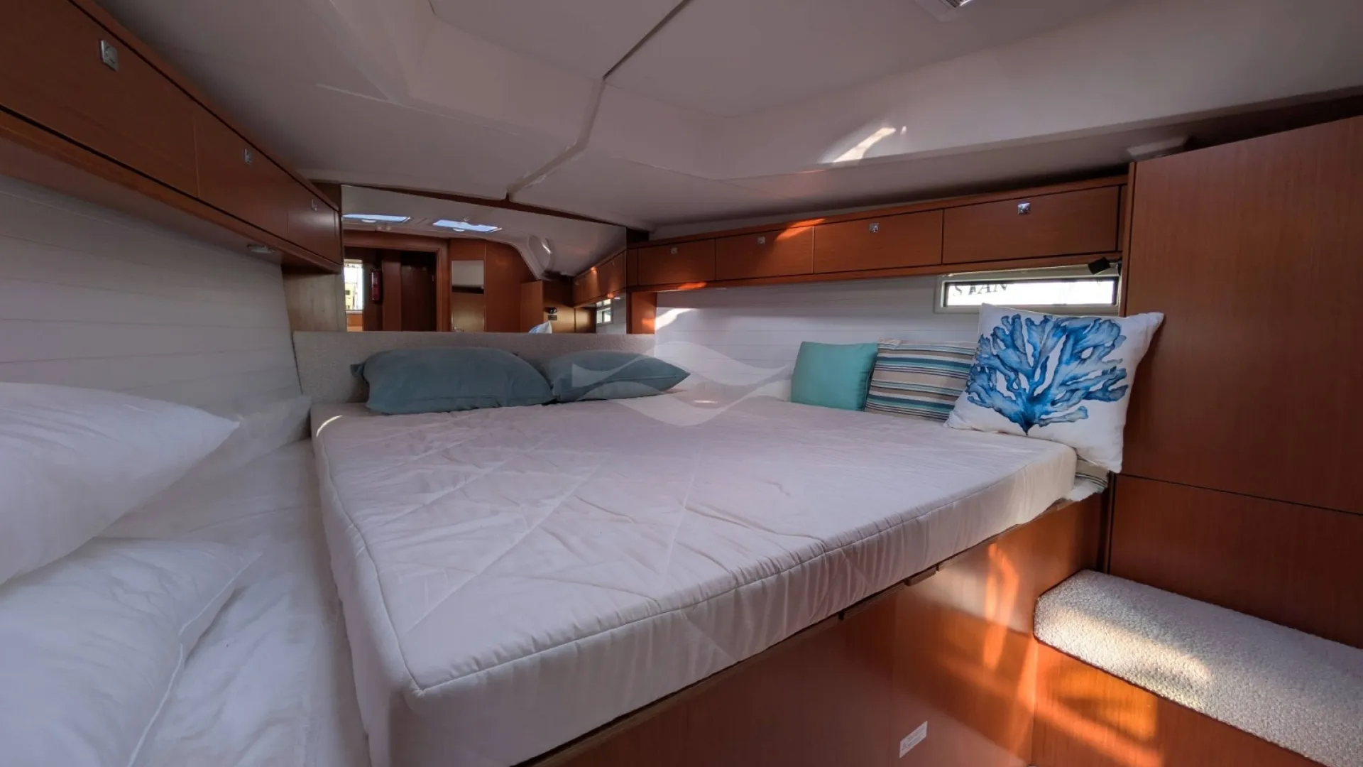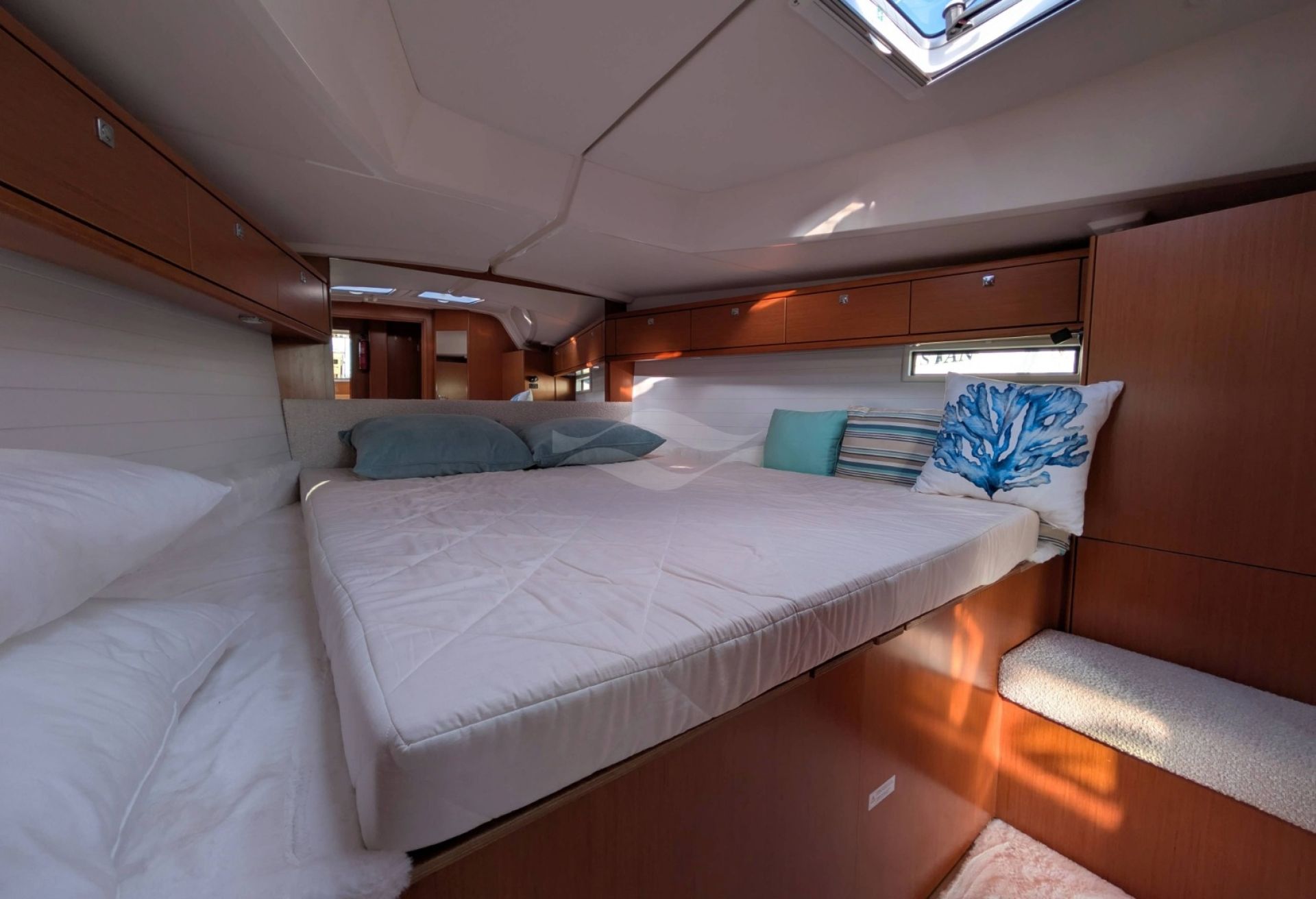 Licensed for 12 passengers (factory rating 16), she provides ample space for groups while maintaining privacy and comfort below deck. Her interior is bright, practical, and designed for life aboard — with generous storage, efficient ventilation, and a layout that seamlessly supports both short getaways and longer cruising adventures.