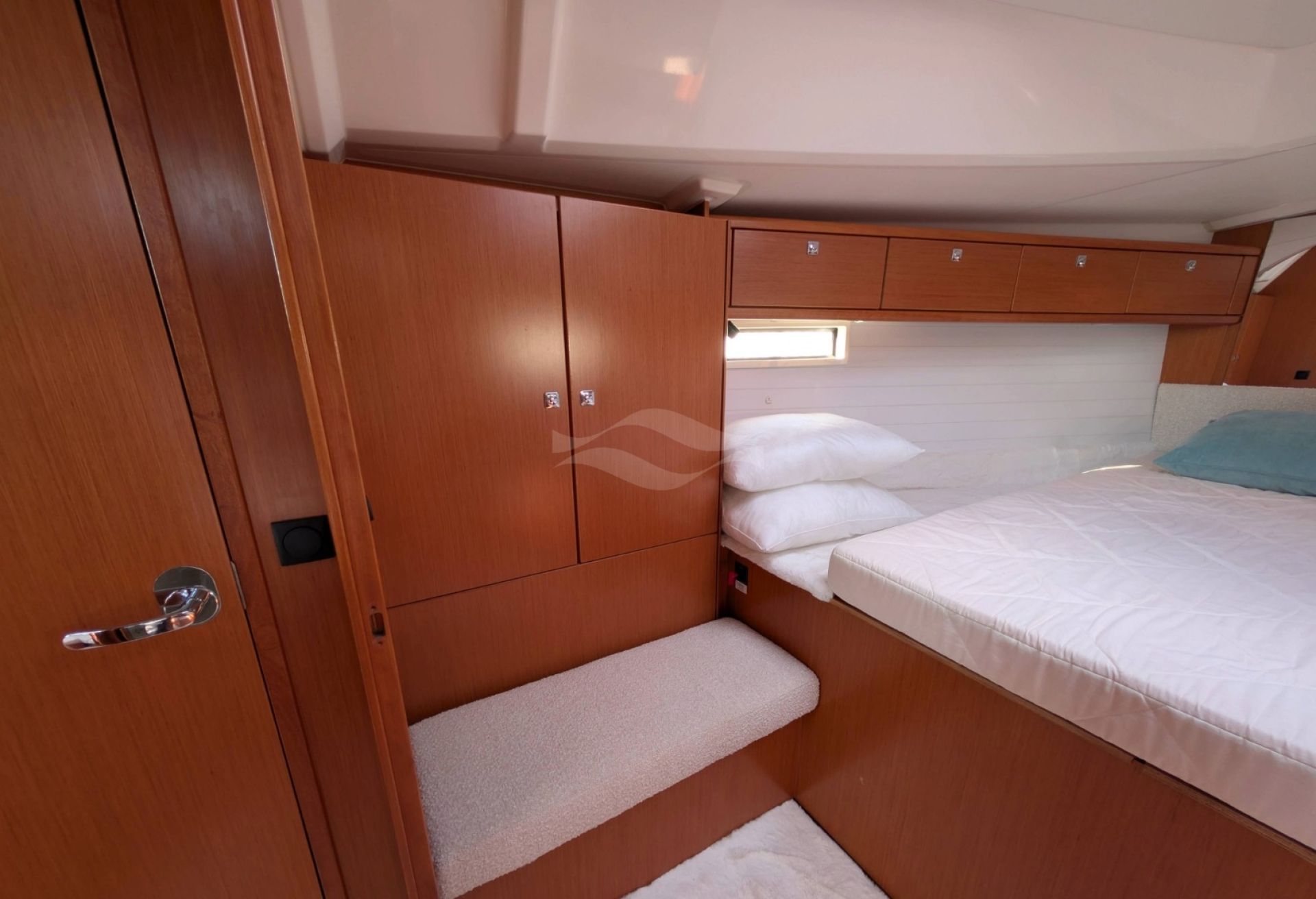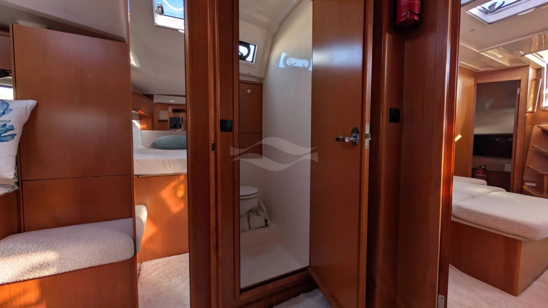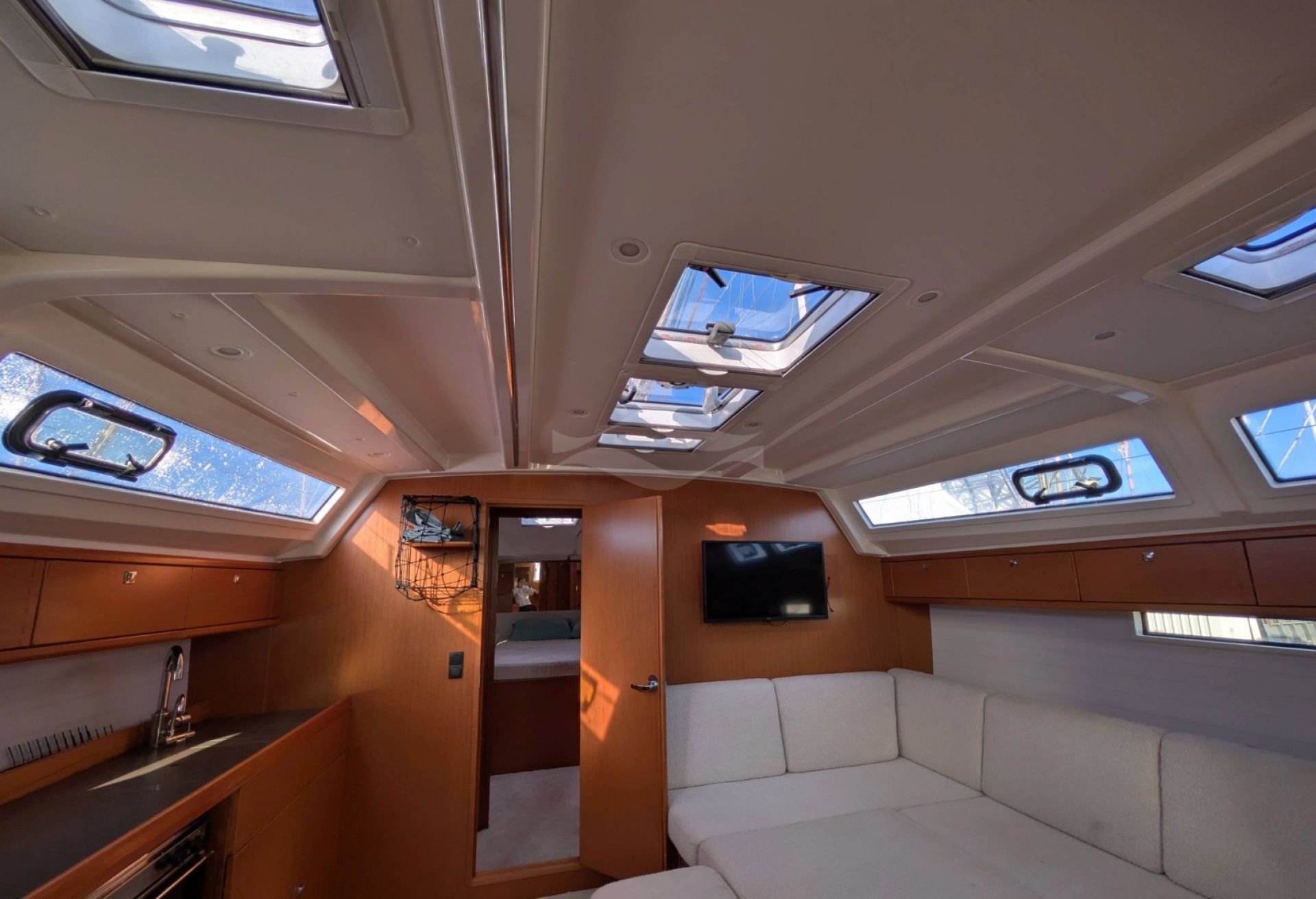 Licensed for 12 passengers (factory rating 16), she provides ample space for groups while maintaining privacy and comfort below deck. Her interior is bright, practical, and designed for life aboard — with generous storage, efficient ventilation, and a layout that seamlessly supports both short getaways and longer cruising adventures.
